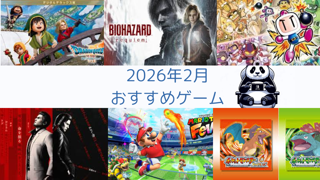 2月は「本命の大作1本」と「軽く遊べるコスパ枠1本」の組み合わせが財布にも優しいプランです。たとえばドラクエかバイオを本命に据えつつ、ボンバーマンコレクションかポケモンをサブに置くと、様々な気分に対応できる理想的な2月になるんじゃないかと思います。今月も良いゲームライフを!